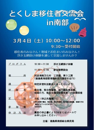 令和5年3月4日(土)徳島県南部圏域の海陽町において、 移住者、 その支援を行う民間団体、 行政関係者、 地域の方々総勢11名が、浮き玉網掛け体験や、 移住者共通の悩みや移住後の感想等の意見交換を通じて、お互いの交流を深める「移住者交流会 in 南部」を開催しました!