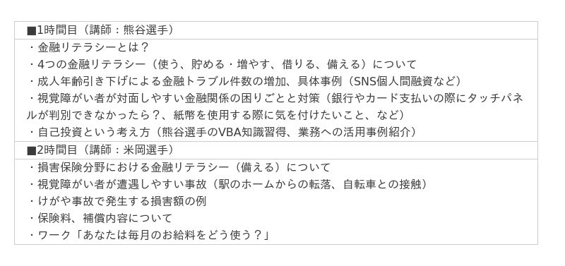 1時間目は三井ダイレクト損保に所属する熊谷選手から、「使う」、「貯める・増やす」、「借りる」、「備える」という4つの金融リテラシーについて説明したほか、成人年齢の引き下げに伴う若年層の金融トラブル増加や視覚障がい者が遭遇しやすい金融関係の困りごとと対策等を紹介しました。