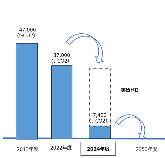 今回、2024年度全館の電力100%をクリーンエネルギー化することにより、全エネルギーの約80% 約30,000(t-CO2)の削減を目指します。