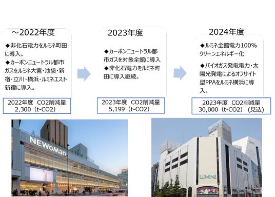 ルミネは、2024年度より、本社を含む、全17拠点の電力100%クリーンエネルギー化を進めています。「再エネJクレジット」「非化石証書」などの環境価値証書※1によるカーボンニュートラル、ルミネ横浜から排出される食品廃棄物を活用した「Jバイオフードリサイクル※2由来の電力」に加え、この度、ルミネ横浜に「太陽光発電によるオフサイト型コーポレートPPA 」を導入いたします。