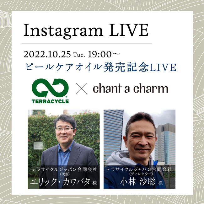 インスタグラムライブでは、テラサイクルジャパン合同会社の日本代表 エリック・カワバタ様、ディレクター 小林沙聡様をゲストにお迎えし、チャントアチャーム 新製品「ピールケオイル」の容器のこだわりや世界のリサイクル事情についてトークいたします。