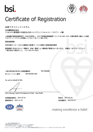 ISO9001は、お客さまニーズに応える製品・サービスを継続的に提供するための仕組みを管理するものです。取得した拠点では、品質マネジメントシステムの構築により、高い安全性と正確性を担保することが可能になります。