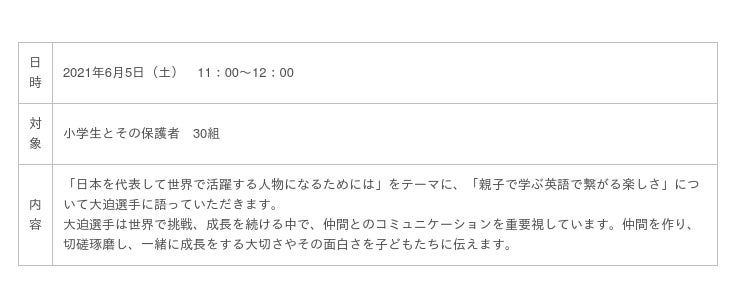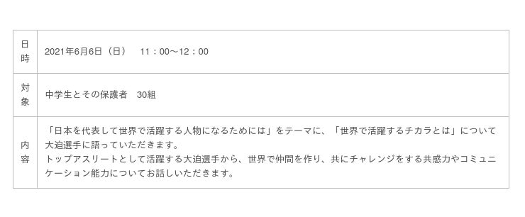 この2日間の「大迫傑 アスリートのグローバル・コミュニケーション教室」に参加する小中学生とその保護者を5月30日(日)まで募集します。詳しい開催概要および応募方法は次ページ以降をご覧ください。