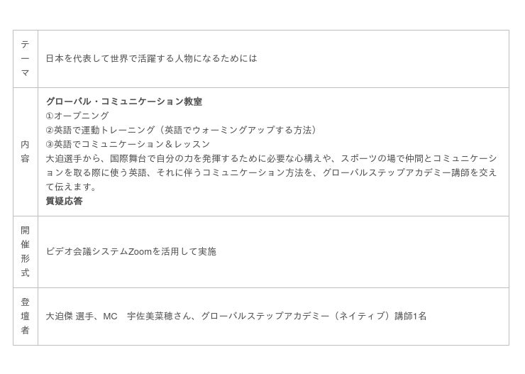 今回は「日本を代表して世界で活躍する人物になるためには」をテーマに、世界陸上競技選手権大会(2015/北京)にも出場し、東京オリンピック内定の大迫傑選手から小中学生に向けて、スポーツの場で役立つ実践的な英語と、仲間とのコミュニケーション方法を、インターナショナルスクールのグローバルステップアカデミーのネイティブ講師をゲストで迎えてインタラクティブに伝えます。6月5日(土)は小学生とその保護者30組を対象に「親子で学ぶ英語で繋がる楽しさ」について、6日(日)は中学生とその保護者30組を対象に「世界で活躍するチカラとは」について双方向のセッションを行い、大迫選手との交流を通じて、子どもたちに世界中の人とスポーツを通じて高めあい、支えあう仲間になれることの喜びを学ぶ機会を提供したいと考えています。また、大迫選手から国際舞台で自分の力を発揮するためのマインドセットについても語っていただきます。