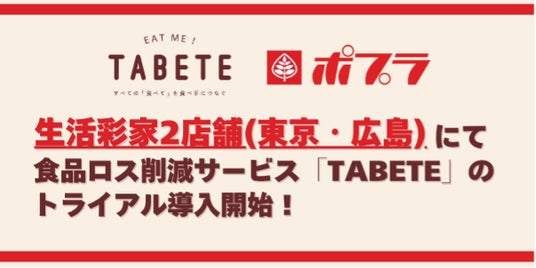 株式会社ポプラが運営するコンビニストアー「生活彩家」の東京と広島の2店舗にて、食品ロス削減対策として「TABETE(タベテ)」を7月15日(火)よりトライアル導入開始