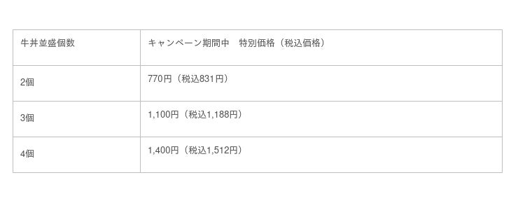 内容:テイクアウト牛丼並盛を2個、3個、4個購入時に特別価格で提供します。
