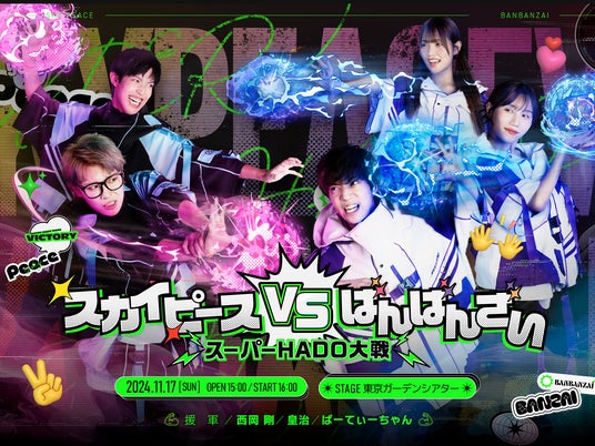 ARスポーツ「HADO」を運営する株式会社meleapは、2024年11月17日(日)に大人気YouTuberグループ「スカイピース」と「ばんばんざい」によるライブ&観客参加型ARスポーツイベント『スカイピース VS ばんばんざい スーパーHADO 大戦』を東京ガーデンシアターにて開催いたします。