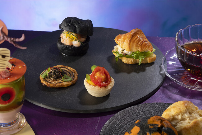 今年のハロウィンは”ホーンテッドアート”と題し、秋の味覚が一度に楽しめるスイーツやセイヴォリーをアートで表現し、目にも楽しいアフタヌーンティーをご用意いたしました。目玉マシュマロを忍ばせたフルーティーなグラスデザート「ラズベリーパンナコッタとマチュドニアゼリー」や、フランケンシュタイン風の「チョコレートとスイートポテトチーズケーキ」などかわいいお化けたちが登場。セイヴォリーにはクランベリーの甘みとアーモンドの食感が楽しい「ローストチキン クランベリー ミニクロワッサン」や旬のかぼちゃをヘルシーに仕上げた「かぼちゃと豆腐のタルトレット」、そして焼き菓子にはジャックオランタンをイメージした「ココアとパンプキンのマーブルスコーン」など遊び心を加えた品々を揃えました。