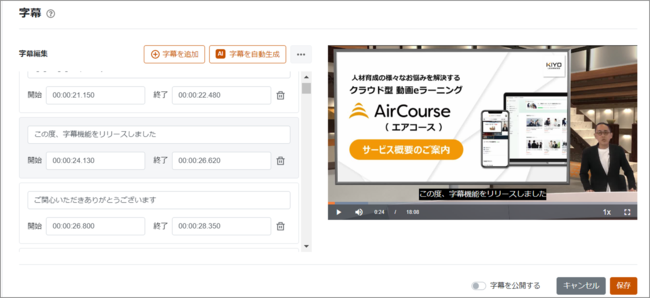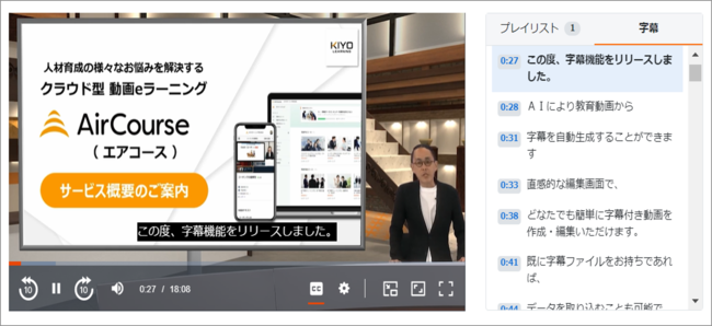 KIYOラーニング株式会社(東京都千代田区、代表取締役社長:綾部貴淑)が提供する企業向け社員教育クラウドサービス「AirCourse(エアコース)」について、AIを活用した動画への「字幕」を自動で生成できる新機能を開発・リリースいたしました。