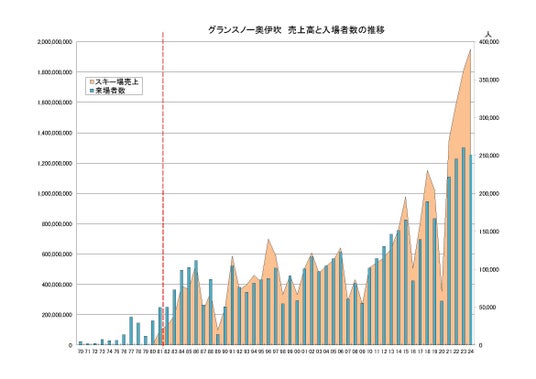 スキー場産業全体として、スキー・スノーボード人口が1800万人と最盛期を迎えた1998年当時のグランスノー奥伊吹(旧:奥伊吹スキー場)の売上高「3億3300万円」(入場者数5万4400人)から比較して、今季は「約6倍」となる「19億5300万円」(入場者数約5倍の25万907人)まで増加しており、近年の「施設全体の魅力アップの為の積極的な設備投資」、「人工降雪機、人工造雪機」での雪造りを中心とした「暖冬、雪不足に対応する対策の実施」が大きく実を結んだ形となっています。