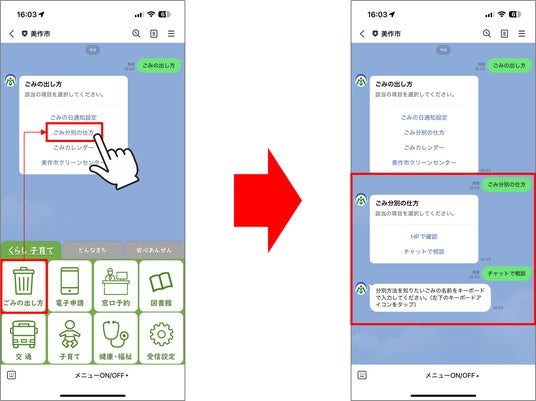 ごみの分別方法に困った際にも、「ごみの分別の仕方」から「チャットで相談」をタップ。「分別方法を知りたいごみの名前」を送信すると、チャットボット機能で分別方法が自動返答されるため、日常的なツールとしてお使いいただけます。