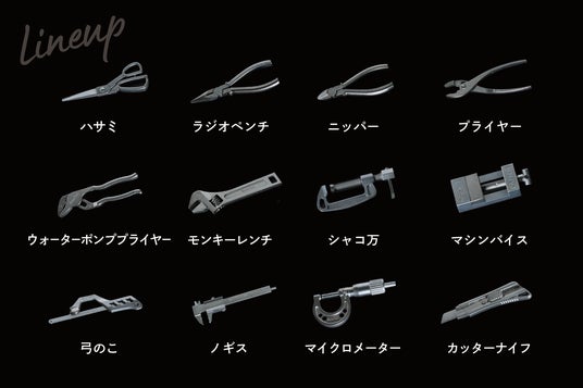 12種類のミニ工具のラインナップは「ハサミ」「ラジオペンチ」「ニッパー」「プライヤー」「ウォーターポンププライヤー」「モンキーレンチ」「シャコ万」「マシンバイス」「弓のこ」「ノギス」「マイクロメーター」「カッターナイフ」となります。