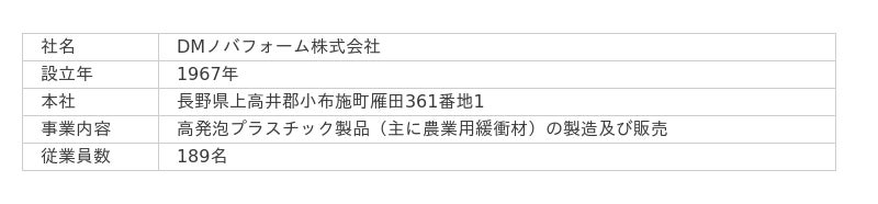 DMノバフォームは、1967年の設立以来、高発泡プラスチックの技術力を深耕し、環境に配慮した信頼性の高い様々な緩衝材を開発・製造して参りました。現在、農業用・工業用の様々な製品群を擁するに至っておりますが、果実の出荷時に使用する包装用クッション材では国内トップの出荷量を誇り、果実の流通には欠かせない存在となっております。また、長野工場(本社)、青森工場及び岡山工場の3拠点より全国に高品質な製品を安定的に供給しており、取引先から高い評価を得ております。
