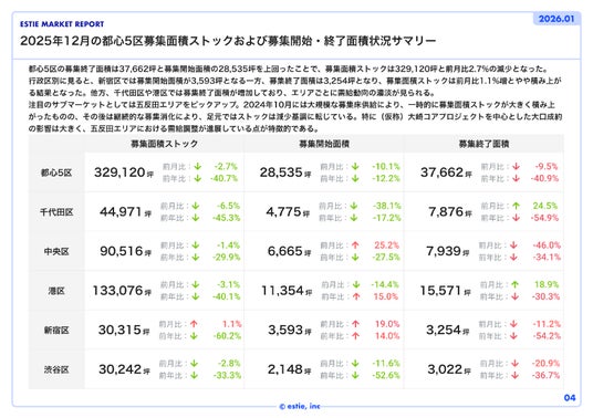 日本最大級の商業用不動産データ分析基盤「estie マーケット調査」を中心に複数のサービスを提供する株式会社estie(本社:東京都港区、代表取締役:平井 瑛、以下「estie」)は、「estie マーケット調査」による分析データをまとめた最新不動産マーケット動向レポート「エスティ マーケットレポート」2026年1月号を配信開始しました。