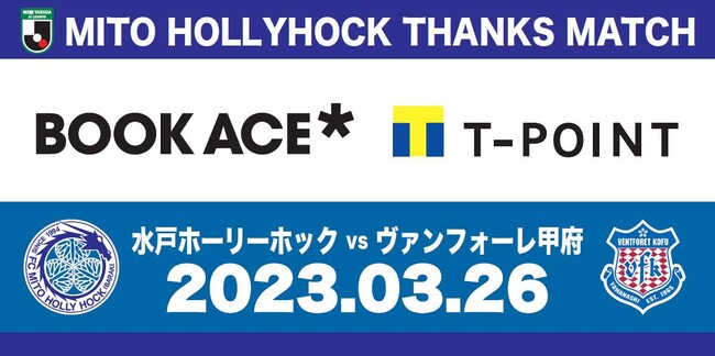 このたび3月26日(日)に開催する2023明治安田生命J2リーグ第6節 水戸ホーリーホックvs.ヴァンフォーレ甲府戦を、株式会社ブックエースにご支援いただき「ブックエース×Tポイントサンクスマッチ」として開催することとなりましたので、下記の通りお知らせいたします。