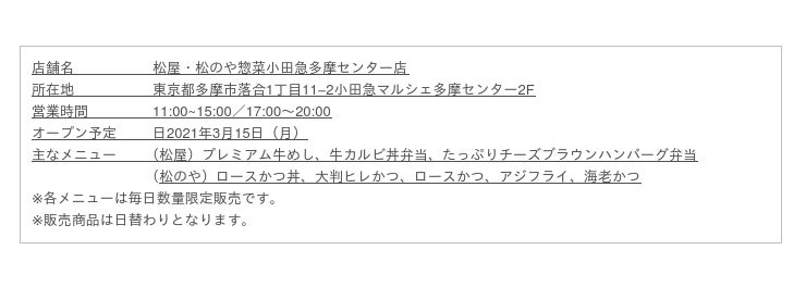 このたび松屋フーズ(本社:東京都武蔵野市、代表取締役社長:瓦葺一利)では、牛めし・カレー・定食・その他丼の「松屋」、とんかつ専門店の「松のや」より弁当・惣菜販売専門店を小田急マルシェ多摩センター内に、2021年3月15日~2021年7月31日の期間限定で開店いたします。