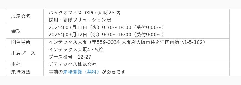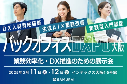 プログラミングスクール「SAMURAI ENGINEER(侍エンジニア)」を運営する株式会社SAMURAIは、2025年3月11日(火)、12日(水)にインテックス大阪で開催される『バックオフィスDXPO大阪'25』に出展いたします。