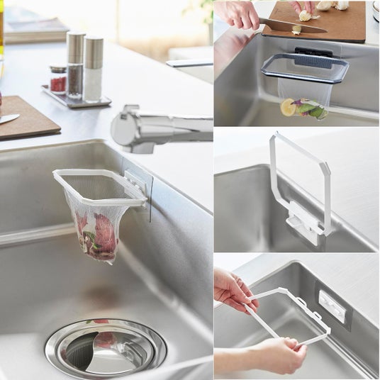フィルムフックでお好みの位置に取り付けられる水切りネットホルダー。