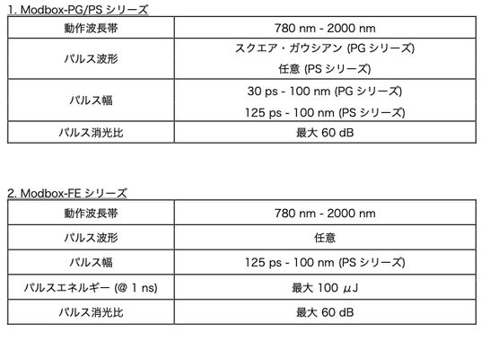 また、上記のサブナノ秒パルスジェネレータ光源システム以外にも、同社のModboxシリーズで、C/L/Oバンドを含めた光通信波長帯に対応した光トランスミッタ、ネットワークアナライザ製品についても取り扱いを行っています。