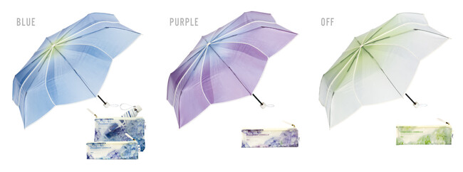 紫陽花は育った土壌によって色が変化する花。傘本体の色味も紫陽花の色の変化をイメージしたグラデーションで表現しました。傘を入れる収納袋にも紫陽花をデザインしています。