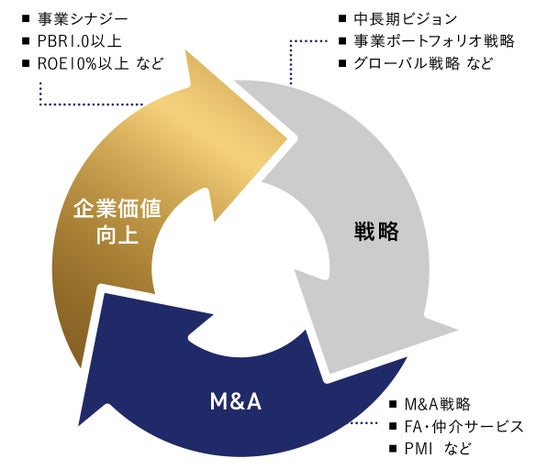 「中長期ビジョン構築」「事業ポートフォリオ戦略構築」「グローバル・ビジョン戦略構築」といった戦略構築フェーズから、「M&A戦略構築」「ファイナンシャルアドバイザリー(FA)・仲介サービス」「統合作業(PMI)」の実装フェーズまで一気通貫で支援。専門コンサルタントがその会社に応じた唯一無二の成長一貫モデルをともに描き、企業価値向上を目指します。PBR1倍割れ・ROE10%以下の上場企業、M&Aで成長したい、M&Aを行っているがどのような企業を買収すれば良いか不明確、PMIに課題があるといった企業の皆さまは、ぜひ「戦略×成長M&A」一貫コンサルティングをご検討いただけますと幸いです。