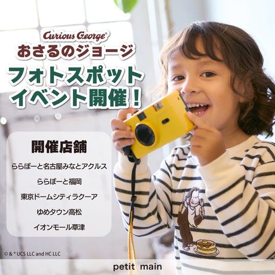 株式会社ナルミヤ・インターナショナル(本社:東京都港区芝公園/代表取締役執行役員社長 國京 紘宇)のブランド「petit main(プティマイン)」がおさるのジョージスペシャルアイテムの発売を記念して、撮影会イベントを開催。