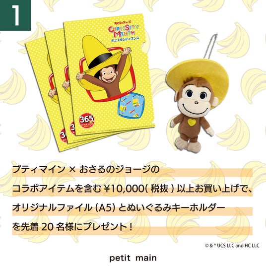プティマイン×おさるのジョージスペシャルアイテム含む、10,000円(税抜)以上お買い上げのお客様に先着でおさるのジョージとの写真撮影会にご参加いただけます。
