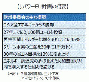 三井住友DSアセットマネジメント株式会社(代表取締役社長 兼 CEO:猿田隆)は、経済イベントや市場動向に関するマーケットレポートを日々発行しております。このたび、マーケットレポート「EUが脱ロシアで『再生可能エネルギー』の普及を加速」を2022年6月3日に発行いたしましたので、お知らせいたします。