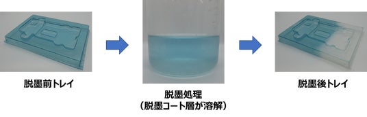 昨年共同開発した「リサイクル可能な導電性シート」は、マルアイ製導電性シート「スーパークリーンシート」に東洋インキの「脱墨技術」を導入することで、導電性シートが有する表面抵抗値や真空成型性を損なわずに印刷した導電インキを容易に脱墨することを可能にした導電性シートです。導電性シートの基材であるプラスチックと導電インキの間にアルカリ処理で溶解する脱墨層を設けることで、導電性シートをアルカリ溶液中で熱処理などを行うと脱墨層が溶解し、導電インキがプラスチック基材から脱墨します。これにより従来はプラスチック廃棄物として処理されていた使用後のプラスチック基材をプラスチック原料として再利用できるようになります。また、導電インキはアルカリ溶液に溶解せず膜の状態で脱墨できるため、膜を回収することでアルカリ溶液も繰り返し使用することができます(※)。