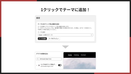 「シンプル右クリック禁止アプリ」は、ボタン一つでストア全体の右クリックを無効化し、画像や文章のコピー・ダウンロードを阻止。ブランド資産を守る手軽なセキュリティ対策アプリです。誰でもすぐに導入でき、サイト表示速度も維持します。