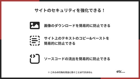 - コンテンツの無断コピー&ダウンロードを防止商品画像・説明文・ブログ記事などのオリジナルコンテンツを守り、第三者による盗用リスクを最小化します。