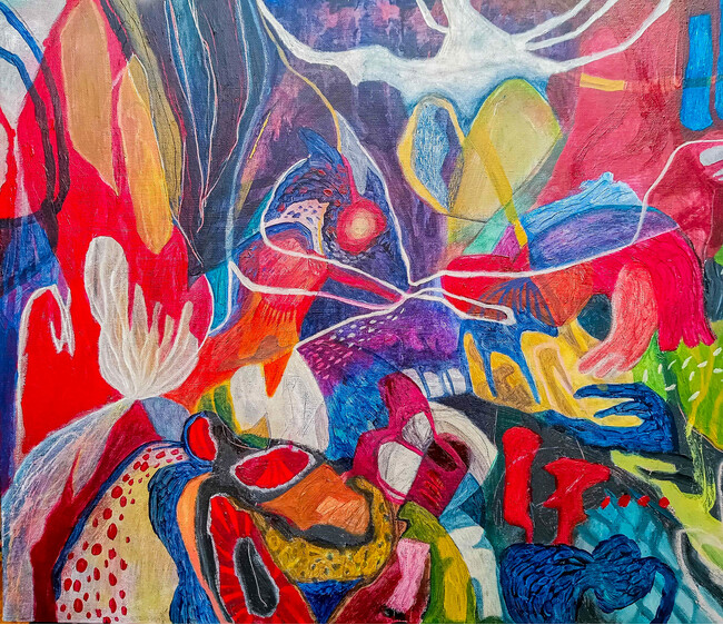 サックス奏者としての顔も持つ画家、岩川真澄。感情をキャンバスにぶつけたようなダイナミックな形象と鮮やかな色彩対比で描かれたアブストラクト・ペインティングに