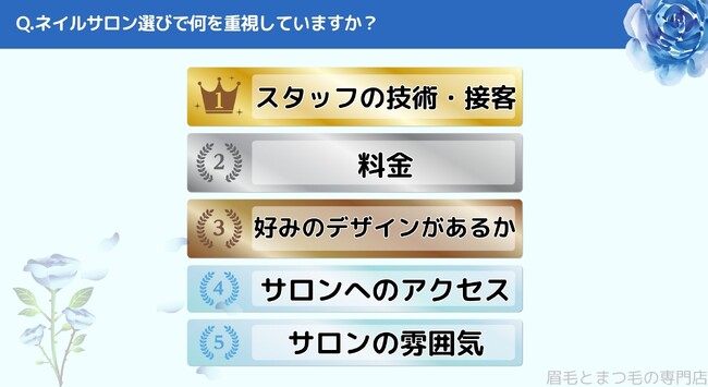 ネイルサロン選びで何を重視しているかお聞きしたところ「1位>スタッフの技術・接客」、「2位>料金」、「3位>好みのデザインがあるか」、「4位>サロンへのアクセス」、「5位>サロンの雰囲気」という結果になりました。