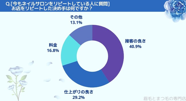 お店をリピートした決め手をお聞きしたところ「接客の良さ(40.9%)」、「仕上がりの良さ(29.2%)」、「料金(16.8%)」、「その他(13.1%)」という結果になりました。