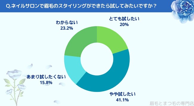 ネイルサロンで眉毛のスタイリングができたら試してみたいかお聞きしたところ「とてもしたい(20%)」、「やや試したい(41.1%)」、「あまり試したくない(15.8%)」、「わからない(23.2%)」という結果になりました。
