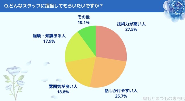 どんなスタッフに対応してもらいたいかお聞きしたところ「技術力が高い人(27.5%)」、「話しかけやすい人(25.7%)」、「雰囲気が良い人(18.8%)」、「経験・知識がある人(17.9%)」、「その他(10.1%)」という結果になりました。