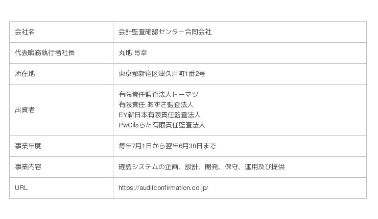 有限責任監査法人トーマツは、2018年11月30日付で、有限責任 あずさ監査法人、EY新日本有限責任監査法人、PwCあらた有限責任監査法人との共同出資により、会計監査確認センター合同会社を設立しました。