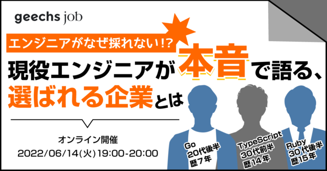 ギークス株式会社(本社:東京都渋谷区、代表取締役CEO:曽根原 稔人、以下ギークス)は、2022年6月14日(火)19:00~20:00にて、エンジニア採用に悩む企業の採用・人事担当者に向けたオンラインセミナー「エンジニアがなぜ採れない!?現役エンジニアが本音で語る、選ばれる企業とは」を開催することをお知らせします。