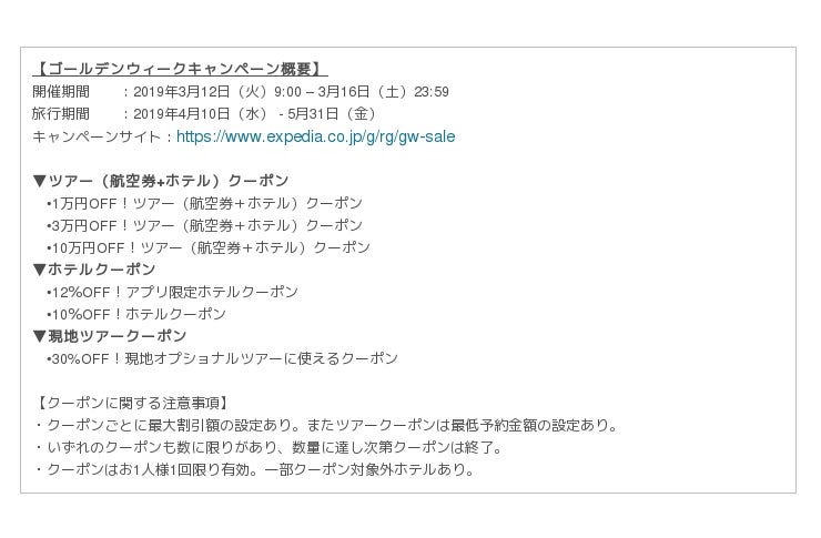 世界最大級の総合旅行サイト・エクスペディアの日本語サイト、エクスペディア・ジャパン(https://www.expedia.co.jp/)は、2019 年3月12 日(火)9:00 - 3月16 日(土)23 :59 の期間限定で、ゴールデンウィークを含む同年4月10日(水) ~ 5月31日(金)の旅行に使用できるクーポンを配布する「ゴールデンウィークキャンペーン」を実施します。