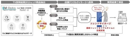 エム・データが保有するテレビ番組・CMの膨大な「TVメタデータ(※1)」から、影響力のある番組で紹介された商品や、番組での紹介回数が多い商品、有名人が推薦した商品、CM放映回数の多い商品などのトレンド情報を基に、アドインテがサイネージ向けのコンテンツを制作し、店頭や店内のデジタルサイネージメディアでお客様に最新のトレンドアイテムとして配信いたします。