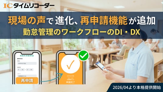 クラウド型勤怠管理システムを提供する株式会社オープントーン(本社:東京都千代田区)は、2026年4月より、ユーザーからの要望が多かった「再申請機能」をリリースいたします。本機能により、一度提出した申請に不備があった際、簡単に修正・再送が可能となります。IT操作に不慣れな現場スタッフの負担を軽減し、管理者側の差し戻し業務を円滑にすることで、月締めの残業削減に貢献します。