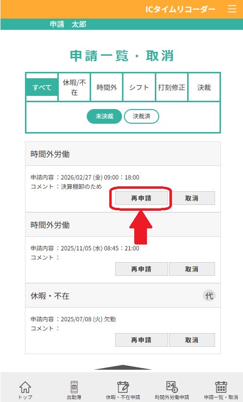 時間外労働申請を頻繁に行う企業様からの要望を受けて実現した「再申請機能」