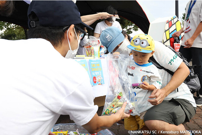 競技場前のPOPアップテントにて、お楽しみ抽選会や、お菓子のつかみ取りのイベントを実施。ご来場のみなさまには、グラフィコ商品の詰め合わせや、当日限定の「南葛SC」×当社フットケアブランド「フットメジ」オリジナルサコッシュなどをプレゼントいたしました。