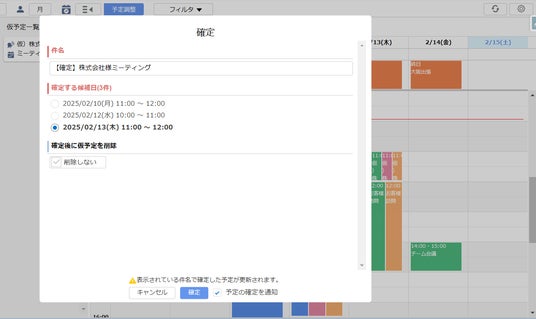 予定の日時が確定され、確定日以外の候補日は一括削除されます。