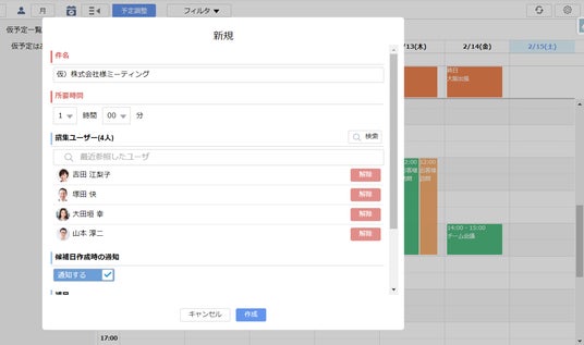 仮予定の情報を元に、日時が仮押さえされます。 仮押さえした予定は通常の予定と同じように編集が可能です。
