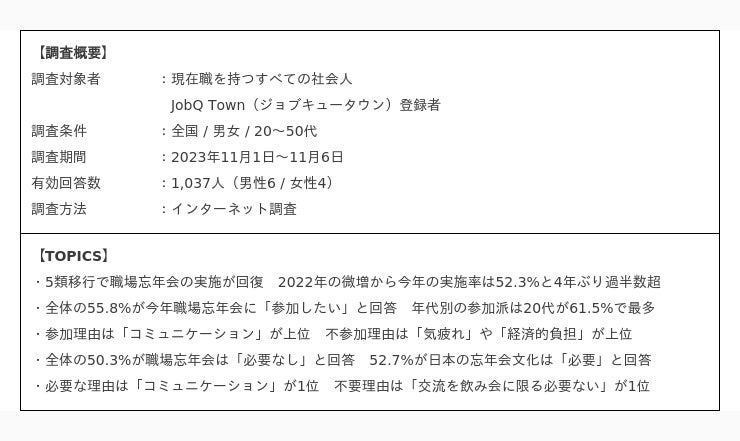 キャリアや就職・転職に特化した匿名相談サービス「JobQ(※1)」を開発・運営する株式会社ライボ(本社:東京都渋谷区 代表取締役:森宏記 以下「ライボ」)の調査機関『Job総研(※2)』は、1,037人の社会人男女を対象に「2023年 忘年会意識調査」を実施しました。