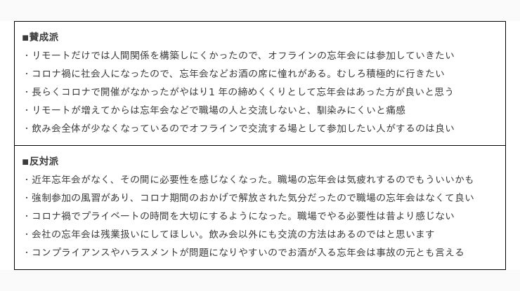 コロナ明けの職場忘年会の必要性ついて、賛否が分かれるコメントが見られました