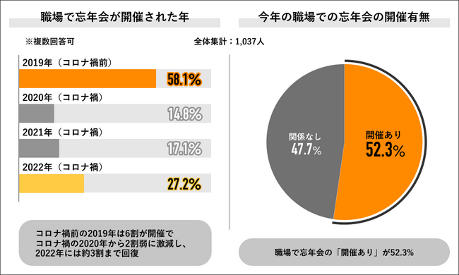 回答者全体の1,037人にコロナ禍前後の忘年会実施の有無を聞くと、職場忘年会の実施はコロナ禍前の2019年では58.1%だったものが、コロナ禍に入った2020年に14.8%まで減少し、2021年には17.8%と微増、2022年に入ると27.2%と回復傾向にあり、今年の職場忘年会の実施有無(未定を除く)では、「開催あり」が52.3%、「なし」が47.7%で、4年ぶりに実施率が過半数を超える結果となりました。
