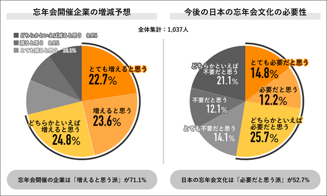 回答者全体の1,037人に今後忘年会を開催する企業は増えると思うかを聞くと、「増えると思う派」の予想は71.1%で過半数を占め、内訳は「とても増えると思う」22.7%、「増えると思う」23.6%、「どちらかといえば増えると思う」24.8%でした。同回答者に今後の日本の忘年会文化の必要性を聞くと、「必要だと思う派」は52.7%で過半数を占め、内訳は「とても必要だと思う」14.8%、「必要だと思う」12.2%、「どちらかといえば必要だと思う」25.7%でした。