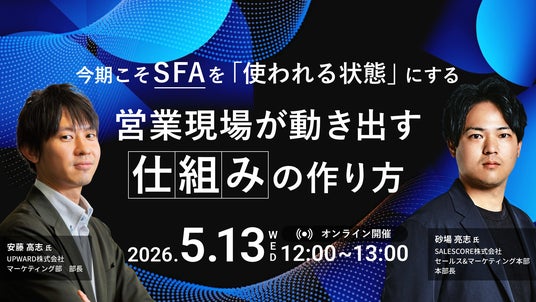 UPWARD株式会社(所在地:東京都千代田区、代表取締役 CEO:金木 竜介、以下 UPWARD)は、2026年5月13日(水)に、SALESCORE株式会社(本社:東京都渋谷区、代表取締役:中内 崇人 以下 SALESCORE)と共催で、無料オンラインセミナー 「今期こそSFAを『使われる状態』にする 営業現場が動き出す仕組みの作り方」を開催します。